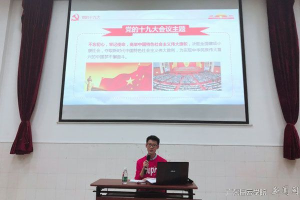 入选广东省“百名团学青年骨干十九大精神朋辈巡讲团”的我校学生李镓洧同学首先为全体学生干部分享了学习十九大精神的体会,他以“十九大与我们的关系”为切入点, 结合大学生学习、生活和就业的方方面面,详尽又不失生动地讲述了十九大精神,这也是我校认真贯彻落实共青团广东省委学校部《关于开展省级“百名团学青年骨干十九大精神朋辈巡讲”活动的通知》的具体体现。同时,李镓洧同学以广东省学联宣传调研部副部长的身份向大家分享了在省学联工作的体会,他分别从“平台”、“执行力”、“培养”三个角度现身说法,告诉大家如何做好一名学生干部。