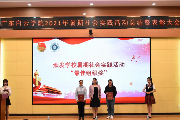 表彰会上,校团委书记王晓艳宣读了《关于表彰广东白云学院2021年暑期社会实践活动优秀个人、优秀团队的决定》,在校团委的精心安排、各二级学院的通力合作以及同学们的共同努力下,大数据与计算机学院、传媒学院、机电工程学院、外国语学院四个学院获得“最佳组织奖”称号,另有70支团队、58位同学、5位教师分别获得了“先进团队”、“先进个人”、“优秀指导教师”称号,此外还有邓沛婷等19人获得“优秀实习生”荣誉称号。