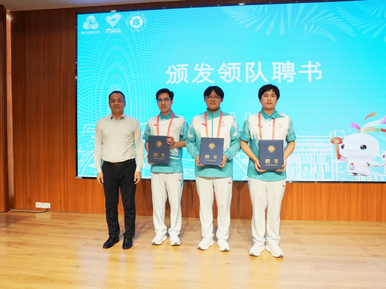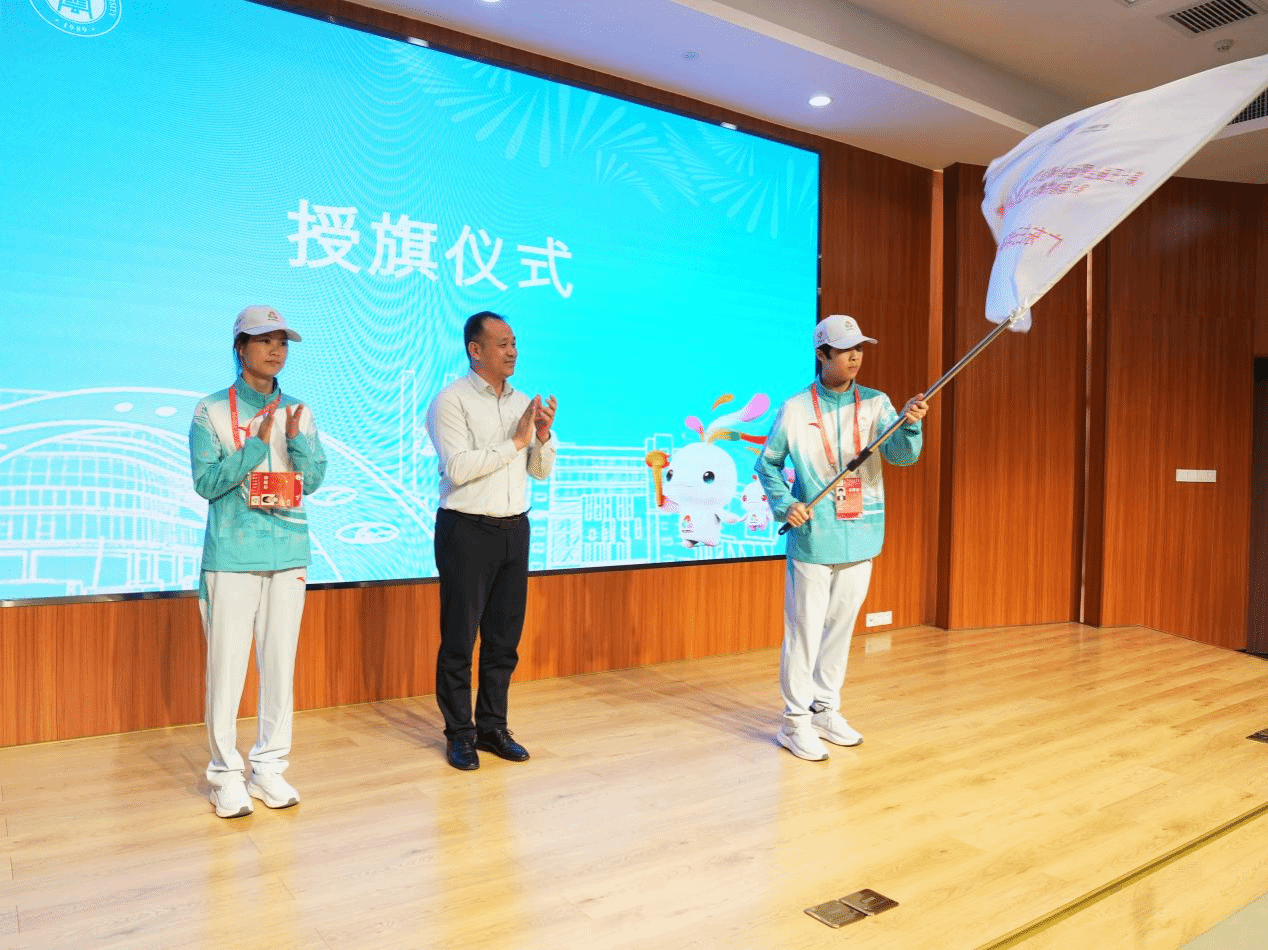 志愿者领队是志愿者队伍的核心力量,陈峰副校长为志愿者领队领队颁发聘书,鼓励他们志愿服务中充分发挥引领作用,为赛事顺利进行做好工作保障。授旗环节中,志愿者代表接过旗帜、奋力挥扬,展示了志愿者队伍的昂扬风貌。